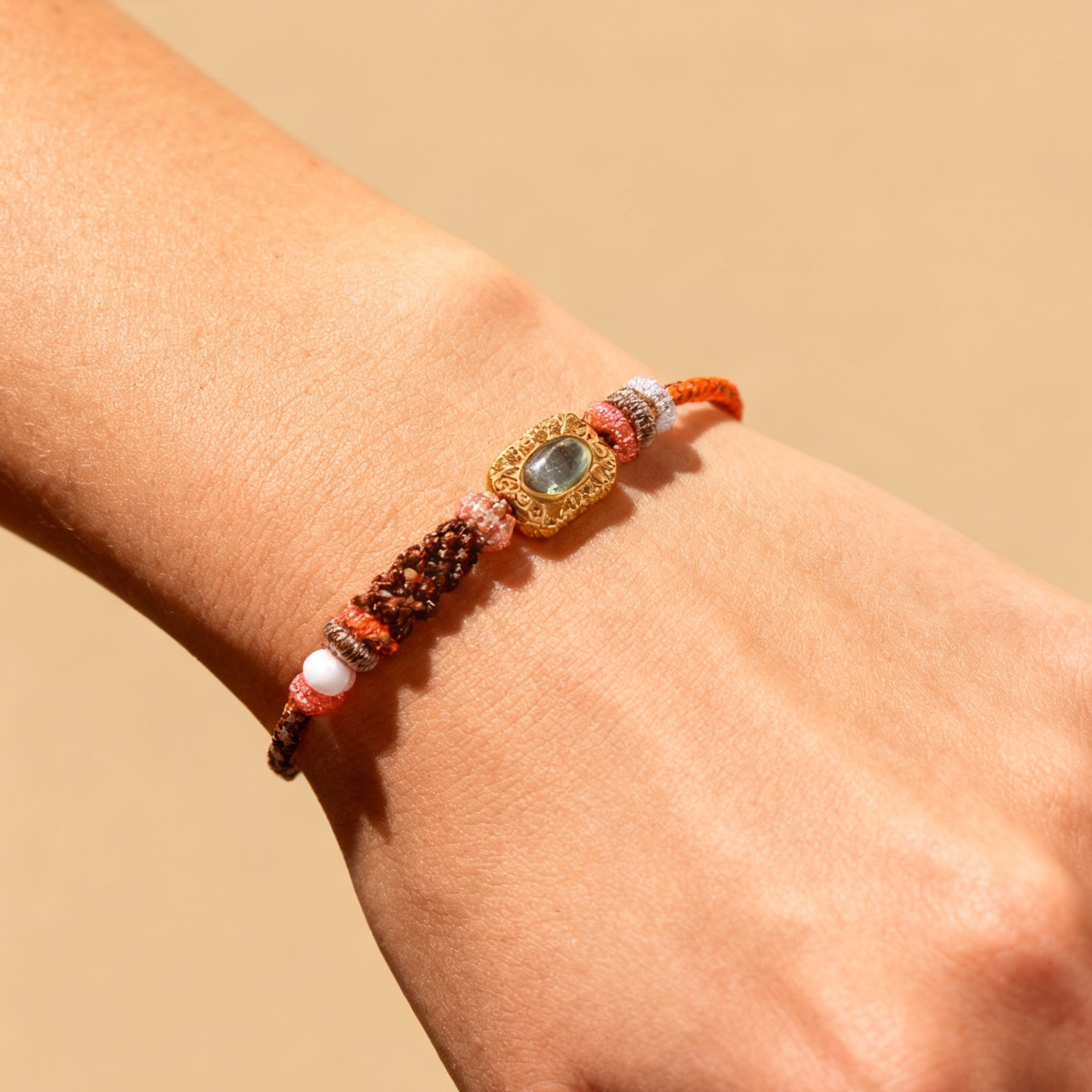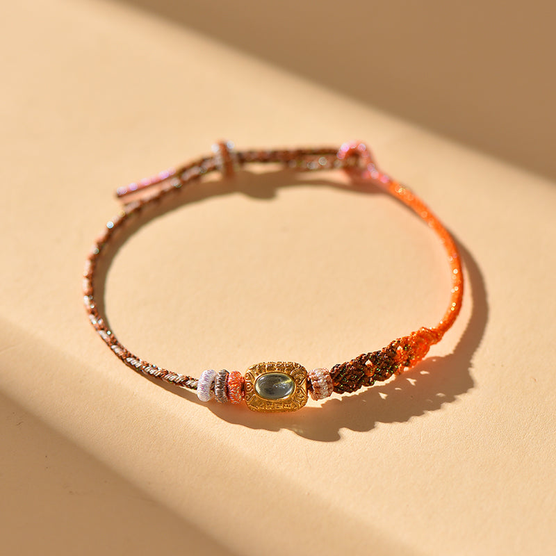 Style: Adjustable handcrafted design Size: Fits wrists up to 24cm (approximately 9.45 inches) Technique: Traditional hand-knotting with gemstone inlay Material: Handwoven silk cord, gold-plated carved setting with golden citrine, nylon and metallic threads Color Palette: Amber Gold × Coral Orange × Bronze Brown