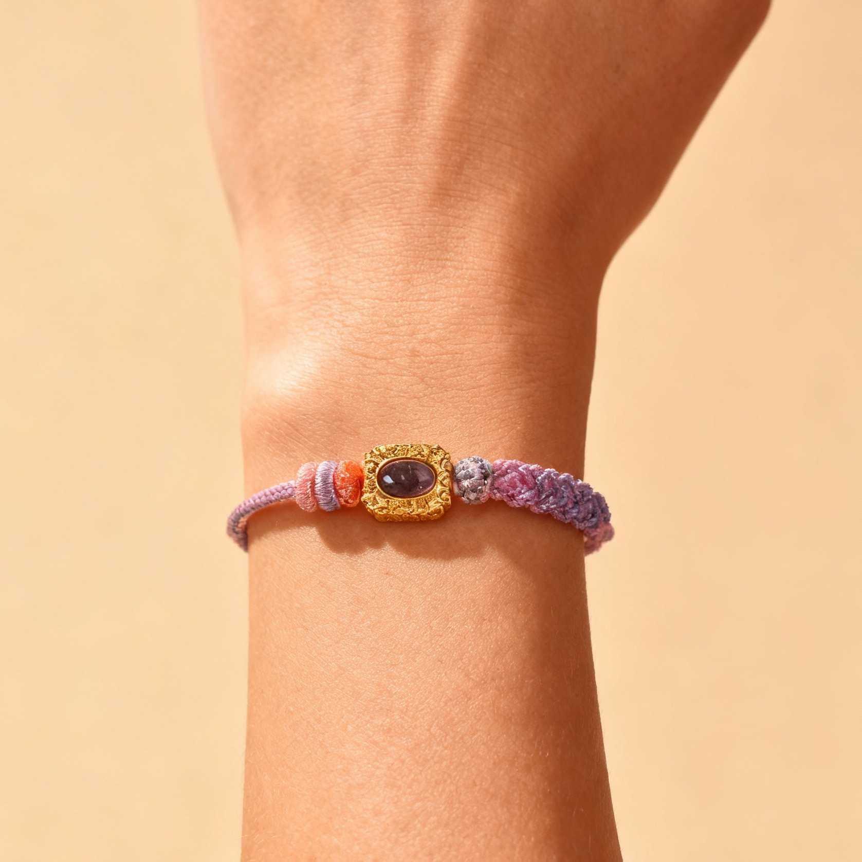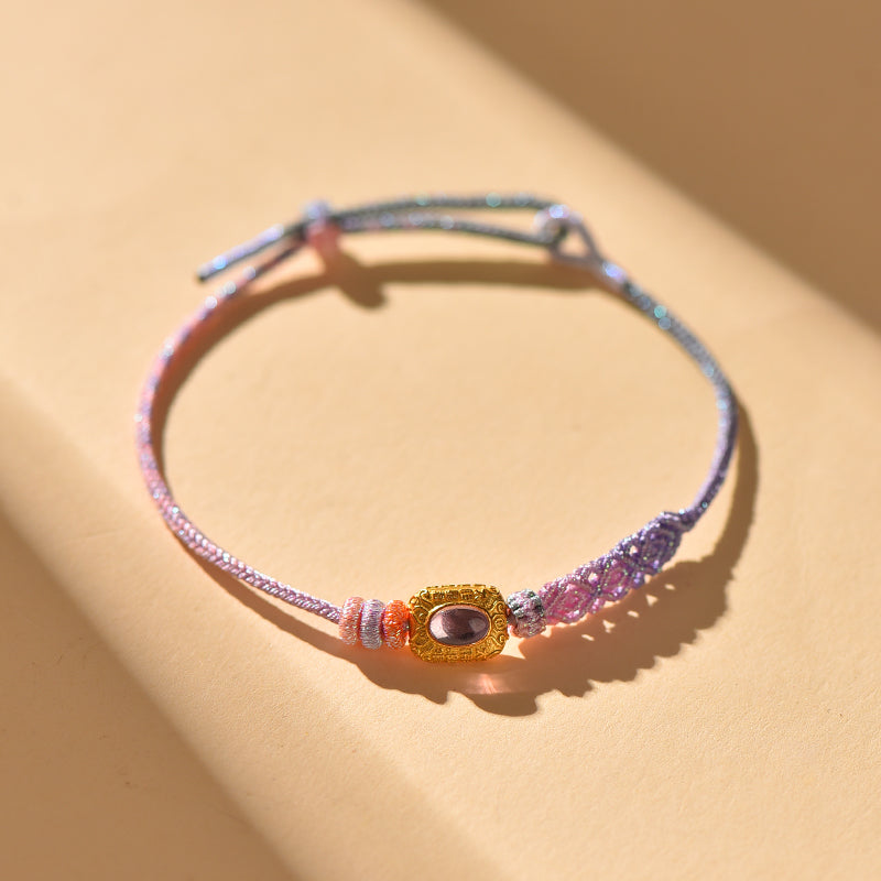 Style: Adjustable handcrafted design Size: Fits wrists up to 24cm (approximately 9.45 inches) Technique: Traditional hand-knotting with gemstone inlay Material: Handwoven silk cord, gold-plated carved setting with amethyst, nylon and metallic threads Color Palette: Misty Lilac × Pearl Pink × Light Blue × Gold