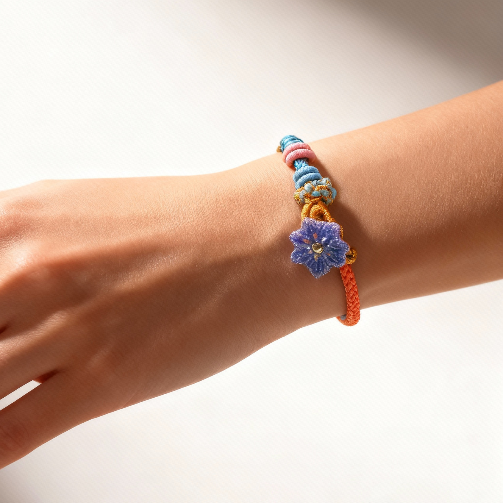 Inspired by the Narcissus, a flower that blooms in the heart of winter, this bracelet embodies renewal and quiet optimism. The harmonious weave of frost blue, sunset orange, and lilac purple mirrors light reflected on still water — pure yet vibrant. Each knot is handwoven to express resilience through stillness, a promise that after every winter, life begins anew.