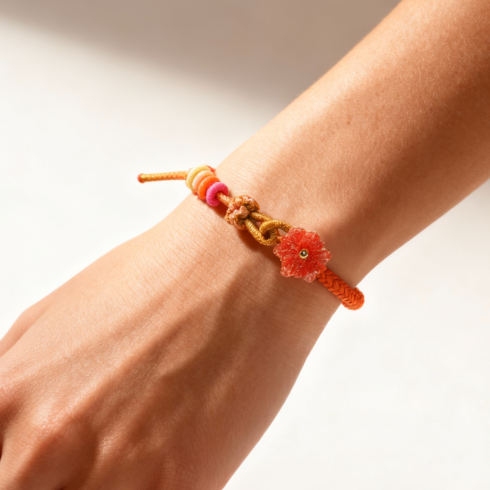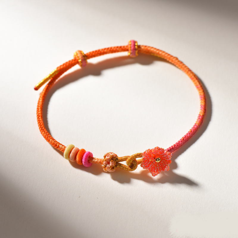Style: Adjustable pull-cord design Size: Fits wrists up to 24cm (approximately 9.45 inches) Technique: 100% handcrafted using traditional Chinese knotting techniques Material: High-strength nylon cord, hand-dyed woven threads Color Palette: Sunset Orange × Soft Pink × Golden Amber Adjustability: Smooth and flexible pull-string mechanism