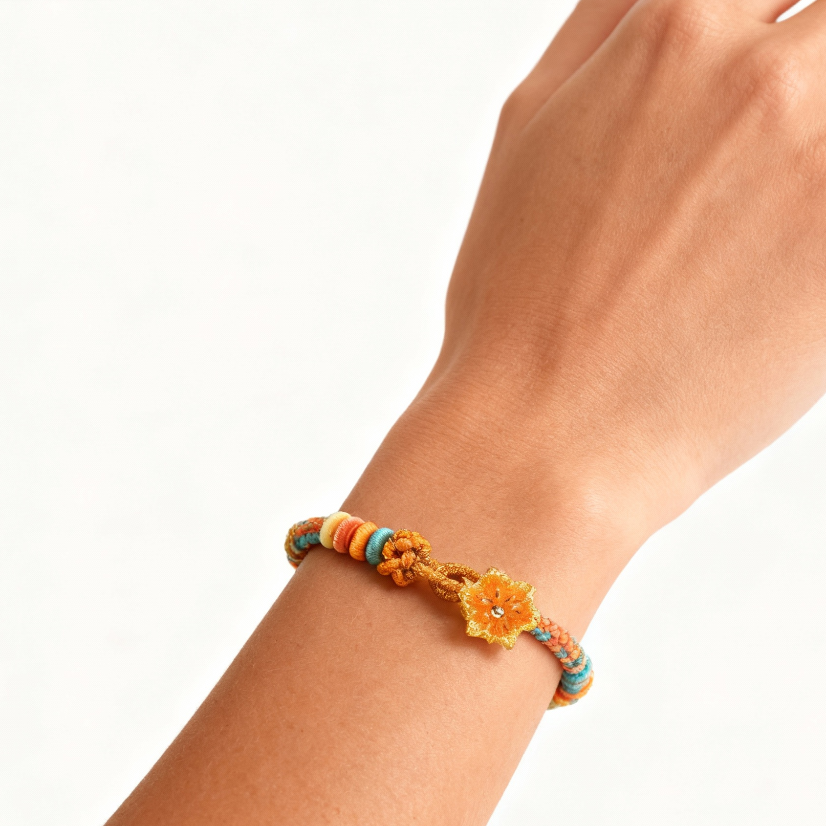 Inspired by the Chrysanthemum, the emblem of autumn grace, this bracelet celebrates resilience and inner strength. The handwoven interplay of amber gold, autumn orange, and sky blue mirrors sunlight over autumn petals — calm yet radiant. Each knot embodies persistence through change, carrying the quiet courage to remain vibrant even in the face of time.