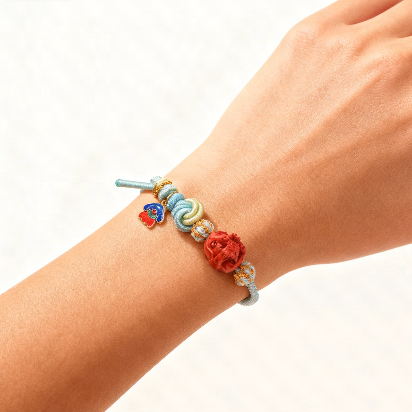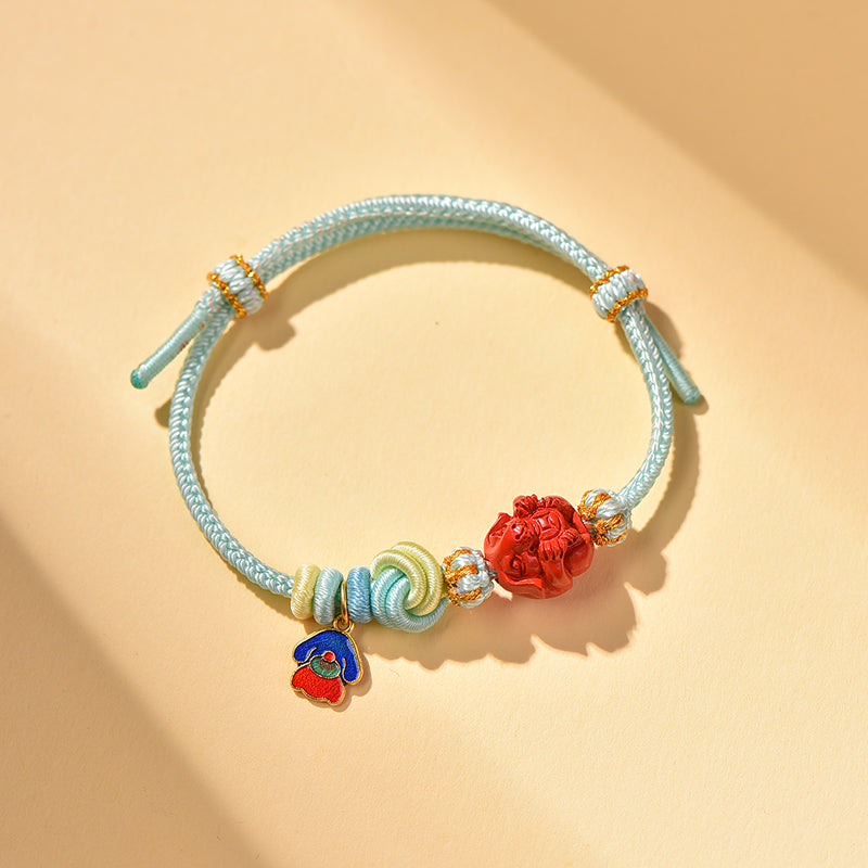 Inspired by the Dog, the timeless symbol of loyalty, faith, and unconditional devotion, this bracelet celebrates the spirit that protects and loves without measure. At its heart lies a hand-carved cinnabar dog charm, glowing in deep red — a symbol of faithfulness and guardian energy. The blend of sky blue, pale mint, and cinnabar red evokes the calm of trust and the warmth of companionship. Every knot is handwoven with care, embodying the steadfast patience and protective grace of this zodiac guardian.