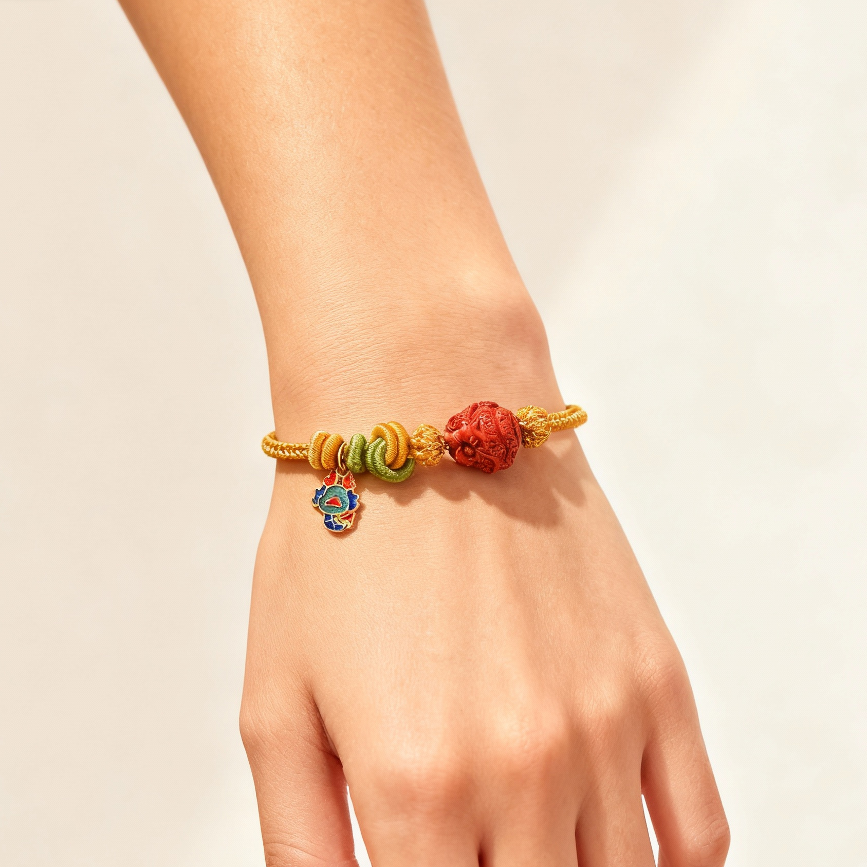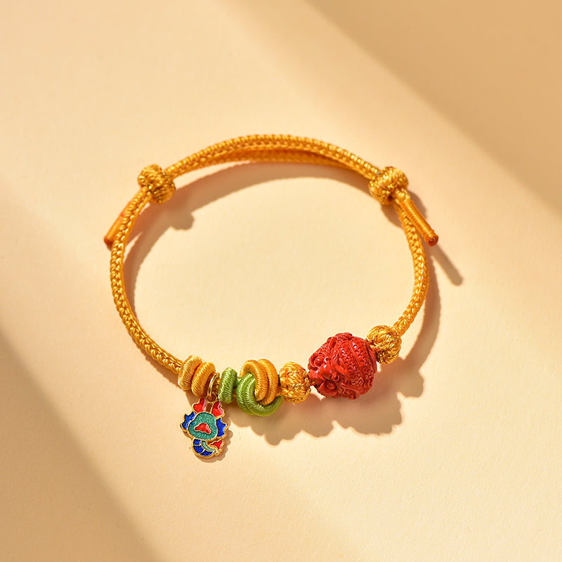 Inspired by the Dragon, a celestial symbol of power, fortune, and transformation, this bracelet channels the spirit of noble strength and limitless vitality. At its heart lies a hand-carved cinnabar dragon charm, radiating in auspicious red — representing courage, ambition, and good fortune. The brilliant fusion of golden yellow, jade green, and cinnabar red mirrors the rising sun through clouds, evoking energy and authority. Each knot is intricately handwoven through traditional Chinese knotting craft, celebrating both artistry and the timeless pursuit of strength.