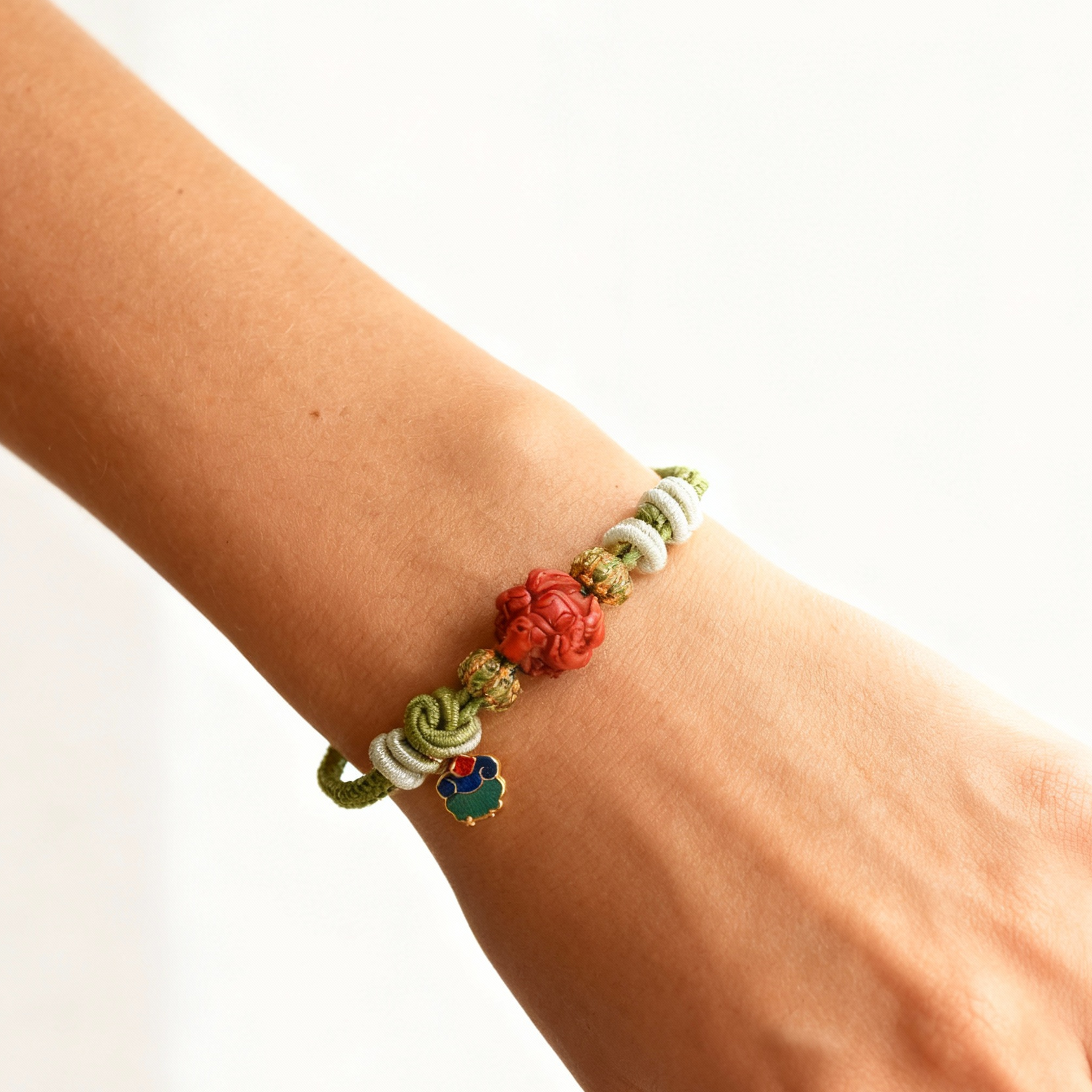 Inspired by the Goat, a timeless symbol of peace, gentleness, and quiet strength, this bracelet embodies the calm wisdom found in tranquility. At its center rests a hand-carved cinnabar goat charm, rich in crimson glow — a symbol of harmony, compassion, and enduring grace. The fusion of leaf green, ivory white, and cinnabar red captures the serenity of nature, the softness of light through trees. Every knot is handwoven with patience and care, channeling ancient craftsmanship into a modern amulet of peace.