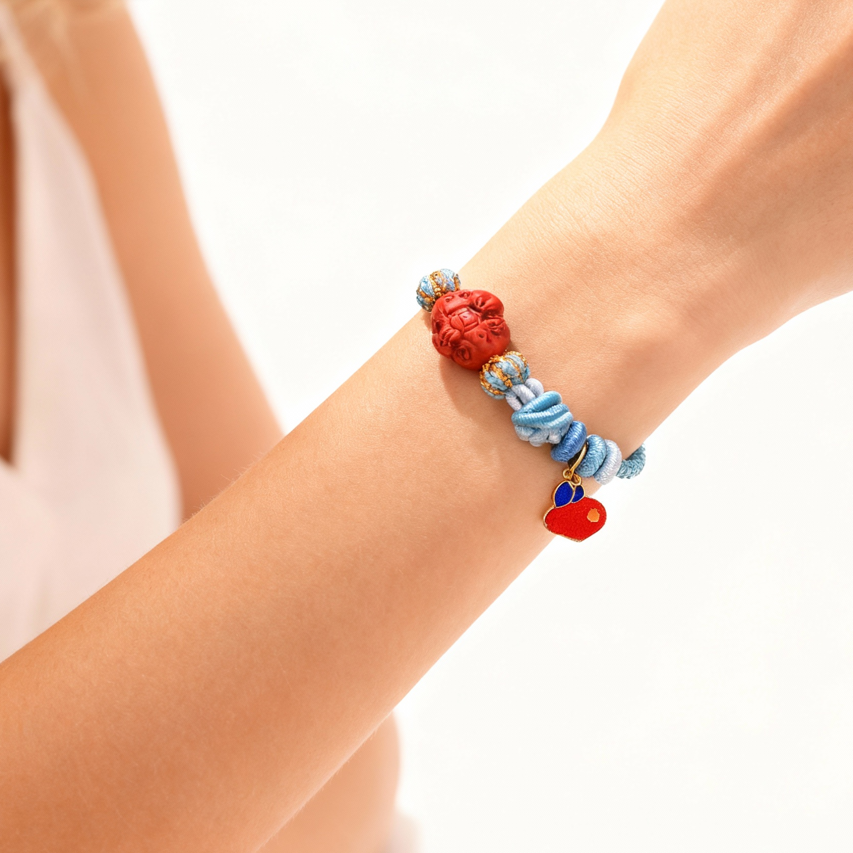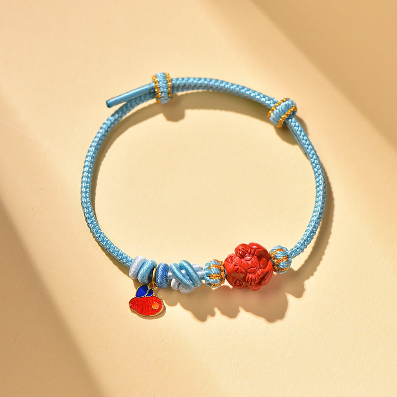 Inspired by the Rabbit, a symbol of gentleness, harmony, and vitality, this bracelet embodies the spirit of quiet grace and good fortune. At its center lies a hand-carved cinnabar rabbit charm, glowing with auspicious red — representing peace, wisdom, and kindhearted strength. The cool tones of sky blue and pearl white, accentuated by warm red details, mirror the tranquility of moonlit nights and the purity of spring’s renewal. Every piece is handwoven using traditional Chinese knotting craftsmanship, carrying with it a serene rhythm of patience and artistry.