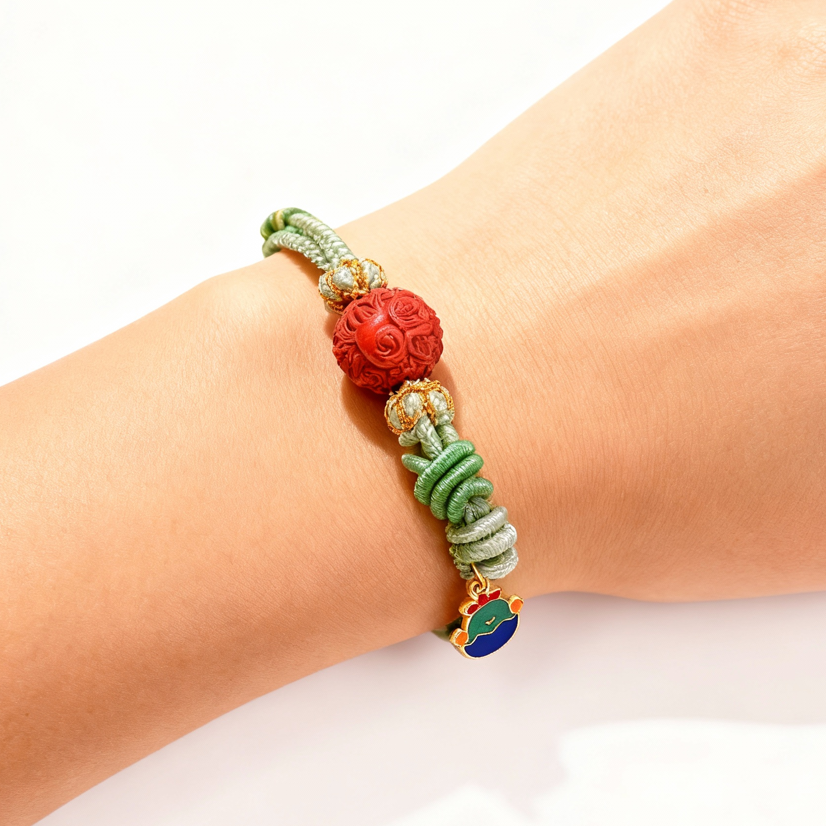Inspired by the Rooster, a symbol of diligence, clarity, and renewal, this bracelet honors the spirit that rises with the dawn. At its center glows a hand-carved cinnabar rooster charm, representing vigilance, persistence, and radiant vitality. The palette of fresh mint green, ivory white, and cinnabar red reflects the first light of morning — calm yet full of promise. Each knot is meticulously handwoven, turning the virtue of diligence into a quiet, wearable grace.